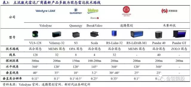 在技术路线方面,各大激光雷达厂商纷纷将发展重心从机械式激光雷达转向了固态激光雷达。固态雷达在成本和可靠性上更有优势,但精度水平仍低于机械式雷达。固态激光雷达三种主流技术路线包括MEMS、OPA相控阵和Flash。基于这三种路线推出的产品有Velodyne的Velarray-32、Quanergy的固态OPA激光雷达S3、速腾聚创的RS-LiDAR-M1等。