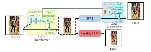 RMPE:本论文主要考虑的是自上而下的关键点检测算法在目标检测产生Proposals的过程中,可能会出现检测框定位误差、对同一个物体重复检测等问题。检测框定位误差,会出现裁剪出来的区域没有包含整个人活着目标人体在框内的比例较小,造成接下来的单人人体骨骼关键点检测错误;对同一个物体重复检测,虽然目标人体是一样的,但是由于裁剪区域的差异可能会造成对同一个人会生成不同的关键点定位结果。本文提出了一种方法来解决目标检测产生的Proposals所存在的问题,即通过空间变换网络将同一个人体的产生的不同裁剪区域(Proposals)都变换到一个较好的结果,如人体在裁剪区域的正中央,这样就不会产生对于一个人体的产生的不同Proposals有不同关键点检测效果。具体Pipeline如下图(摘自论文[14])所示。
