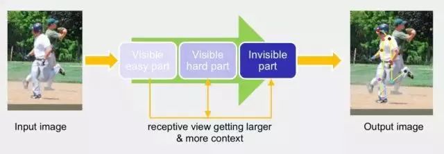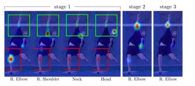 用各部件响应图来表达各部件之间的空间约束,响应图和特征图一起作为数据在网络中传递。人体关键点在空间上的先验分布会指导网络的学习,假如stage 1的预测结果中右肩关键点的预测结果是正确的,而右肘关键点的预测是错误的,那么在接下来的stage中肩和肘在空间上的先验分布会指导网络的学习。如下图(摘自论文[12])所示。