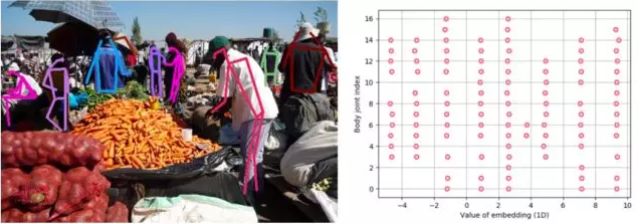 Associative Embedding:该方法通过使用高维空间的向量来编码不同人体的不同关键点之间的关系,即同一个人的不同关键点在空间上是尽可能接近的,不同人的不同关键点在空间上是尽可能远离的,最后可以通过两个关键点在高维空间上的距离来判断两个关键点是否属于同一个人,从而达到聚类的目的。如下图(摘自论文[17])所示。