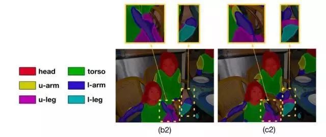 Part Segmentation:即对人体进行不同部位分割,而关键点都落在分割区域的特定位置,通过部位分割对关键点之间的关系进行建模,既可以显式的提供人体关键点的空间先验知识,指导网络的学习,同时在最后对不同人体关键点进行聚类时也能起到相应的连接关键点的作用。如下图(摘自论文[15])所示。