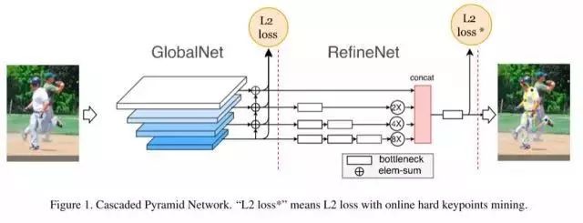Cascaded Pyramid Network:本论文主要关注的是不同类别关键点的检测难度是不一样的,整个结构的思路是先检测比较简单的关键点、然后检测较难的关键点、最后检测更难的或不可见的关键点。具体Pipeline如下图(摘自论文[13]对应slides)所示。