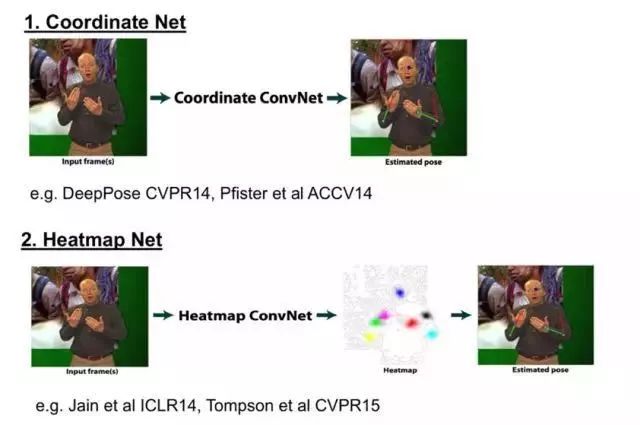 对于两种Ground Truth的差别,Coordinate网络在本质上来说,需要回归的是每个关键点的一个相对于图片的offset,而长距离offset在实际学习过程中是很难回归的,误差较大,同时在训练中的过程,提供的监督信息较少,整个网络的收敛速度较慢;Heatmap网络直接回归出每一类关键点的概率,在一定程度上每一个点都提供了监督信息,网络能够较快的收敛,同时对每一个像素位置进行预测能够提高关键点的定位精度,在可视化方面,Heatmap也要优于Coordinate,除此之外,实践证明,Heatmap确实要远优于Coordinate,具体结构如下图所示。