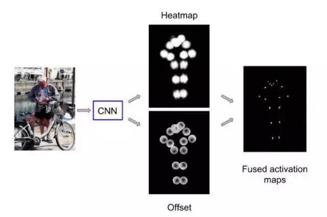 最后,对于Heatmap + Offsets的Ground Truth构建思路主要是Google在CVPR 2017上提出的,与单纯的Heatmap不同的是,Google的Heatmap指的是在距离目标关键点一定范围内的所有点的概率值都为1,在Heatmap之外,使用Offsets,即偏移量来表示距离目标关键点一定范围内的像素位置与目标关键点之间的关系。目前还没有在公开的论文看到有人比较过这两种Ground Truth构建思路的效果差异,但是个人认为Heatmap + Offsets不仅构建了与目标关键点之间的位置关系,同时Offsets也表示了对应像素位置与目标关键点之间的方向信息,应该要优于单纯的Heatmap构建思路。如下图所示(摘自论文[9]。