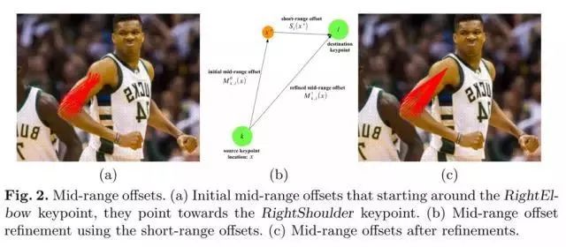 Mid-Range Offsets:该方法通过直接回归一个关键点到另一个关键点之间的offset来建模两个关键点之间的关系,这种较长距离的offsets是较难学习的,在回归具体数值时会有较大误差,这里可以用关键点周围的Short-Range Offsets去进一步Refine对应的offsets。具体如下图(摘自论文[18])所示。