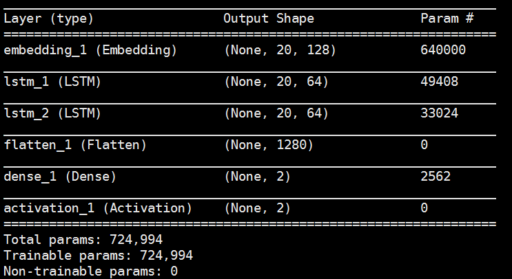 本项目的代码采用了 Keras 实现,底层框架是 Google 开源的 TensorFlow。整个模型包含 6 层,核心层包括 Embedding 输入层、中间层(LSTM)、输出层(Softmax)。模型中的 Flatten 和 Dense 层用于做数据维度变换,将上一层输出数据变换为相应的输出格式,最终的输出是一个二维数组,用于表达输入文本是正面或者负面的概率分布,格式形如 [0.8, 0.2]。