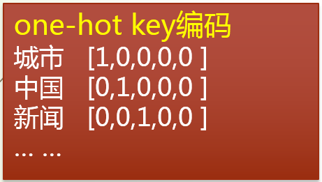 模型的输入是一段已经分词的中文文本,但它无法直接被模型识别,因此我们要将它转换成一种能被模型识别的数学表达。最直接的方式是将这些文本中的词语用“One-Hot Key”进行编码。One-Hot Key是一种比较简单的编码方式,假设我们一共只有5个词,则可以简单地编码为如下图所示: