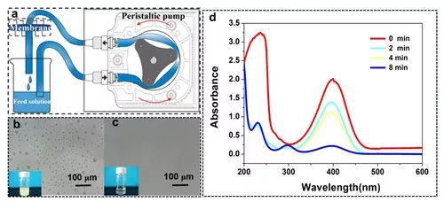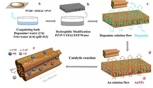 1)PVDF瞬时催化及油水分离膜。针对复杂体系的油水分离问题,以机械性能和热稳定性能优异的聚偏氟乙烯(PVDF)为基膜,制备得到具有微纳米多级组装结构的PVDF-AuNPs微反应器分离膜。首先利用聚多巴胺作为膜表面“功能涂层”,对PVDF基膜进行初步修饰,然后将AuNPs微球通过动态过滤的方法负载到PVDF的指状孔内,形成微反应器。所得膜能够对含有硝基苯酚的水包油复杂体系,实现瞬时的硝基苯酚催化降解和油水分离。该方法对于将油水分离膜应用于实际含油废水处理,起到了重要的推动作用。相关工作已经发表于Chemical Engineering Journal, 2018, 334,579,副研究员王建强和吴紫阳为共同第一作者,刘富为通讯作者。