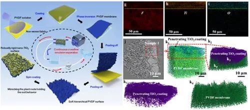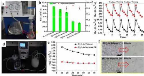 2)具有超稳定刚性浸润表面的柔性PVDF油水分离膜。针对通常聚合物微孔膜的表面微纳结构不稳定、在化学腐蚀及物理损伤下易蠕变及衰减的问题,通过仿生植物根系固定土壤模型,利用微孔PVDF膜表面的微纳结构限域固定TiO2纳米粒子,制备了具有刚性界面TiO2界面的柔性PVDF微孔膜。所得膜具有优异的稳定性,能够抵抗极端物理损伤(液压、手指擦拭、液氮淬火后砂纸磨擦)、高温和苛刻的化学腐蚀(强酸、强碱、强氧化剂次氯酸钠),并且能够连续有效分离含有表面活性剂的油包水乳液。在错流模式下,通过负载超亲水纳米TiO2粒子制备的PVDF膜,可实现水包油乳液的连续分离(通量达1700 ,分离效率>96%)(如图3)。 相关工作已经发表于Scientific Reports, 2017, 7: 14099,副研究员熊竹和林海波为共同第一作者,刘富为通讯作者,文章发表后受到了同行的广泛关注,该论文是2017年Scientific Reports期刊阅读量最多的前100篇文章之一。