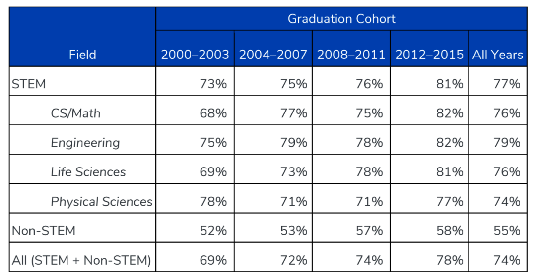 3、STEM 学科留存比例接近:尽管不同领域的留存随年份有所不同,但没有一个 STEM 学科的留存比例始终高于或低于其他学科。