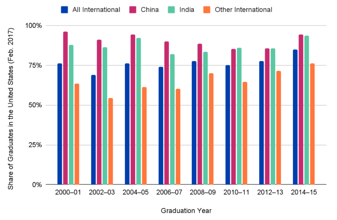 截至 2017 年 2 月,在 2000-2015 年间获得 STEM 博士学位的 90% 中国公民和 87% 印度公民仍在美国生活,而其他国家的毕业生中这一比例仅为 66%。数据还表明,在离开美国的中国和印度毕业生中,大多数是在毕业后立即离开的,而其他国际学生则更有可能随着时间的推移逐渐离开美国。