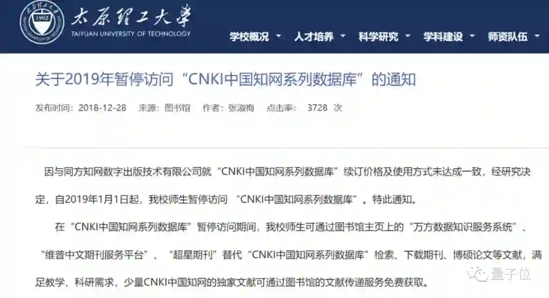 2018年12月,太原理工大学在其官网也挂出“停用知网”的公告: