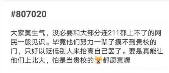 “又穷酸又恶臭的中国网民舆论绑架北大”; “当助教把他们挂走”; “十几年的奋斗比不过一个投机取巧的家伙”; “没必要和大部分211都上不了的网民一般见识”; “如果让这些叫嚣的网民到北大当狗,估计他们都愿意”......