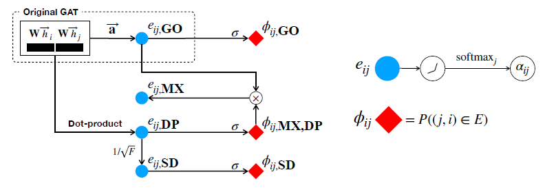 文中通过结合原始GAT模型提出了四种注意力的设计方案,分别是: GO、DP、SD和MX