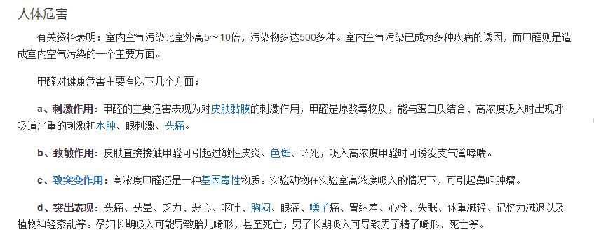 甲醛达到0.6mg/m³,可引起咽喉不适或疼痛。浓度更高时,可引起恶心呕吐,咳嗽胸闷,气喘甚至肺水肿;