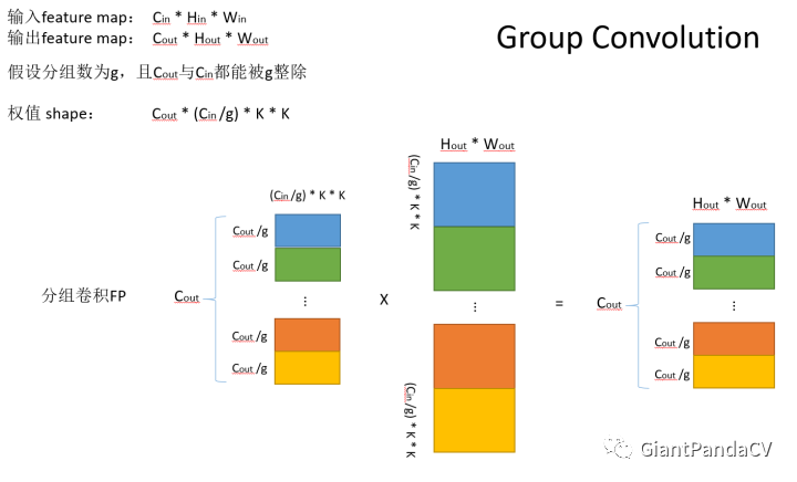 所以看上图,在把输入作im2col操作的时候也是按组来做的,每组 feature map 都会生成一个 的矩阵,然后与对应的权值做乘法,就是图中的相同颜色部分,每组做完乘法就得到了输出feature map,如果还有偏置则是最后再加上,所以分组卷积的运算量就可以求到的了。