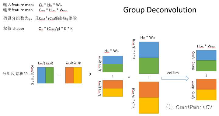 然后在前向过程中,对于每组的计算,权值首先需要转置一下,得到 的权值矩阵然后和输入对应的组数做乘法,然后得到输出对应的组的中间结果,然后每一组的中间结果再通过 col2im 回填到输出 feature map 对应的组的位置。