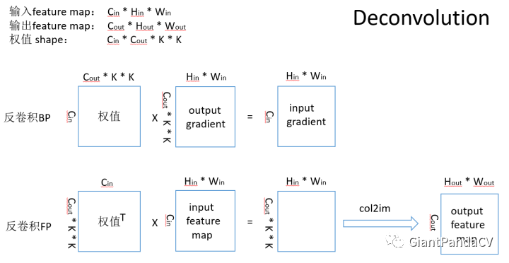 然后我们直接看反卷积的前向操作,和卷积的后向操作对应,权值做转置与输入feature map做一个乘法,这里可以看成是一个 的卷积,输出通道数是 ,然后的到中间结果,然后再做一个col2im的操作回填到输出feature map对应的位置上。所以反卷积的运算量如下: