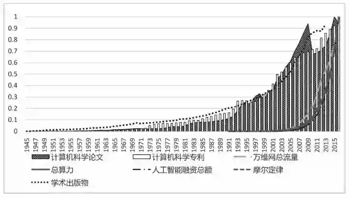 计算机科学论文、计算机科学专利、万维网流量、社会算力、人工智能全球融资总额、摩尔定律及学术出版物的增长趋势对比(引自《人工智能简史》)