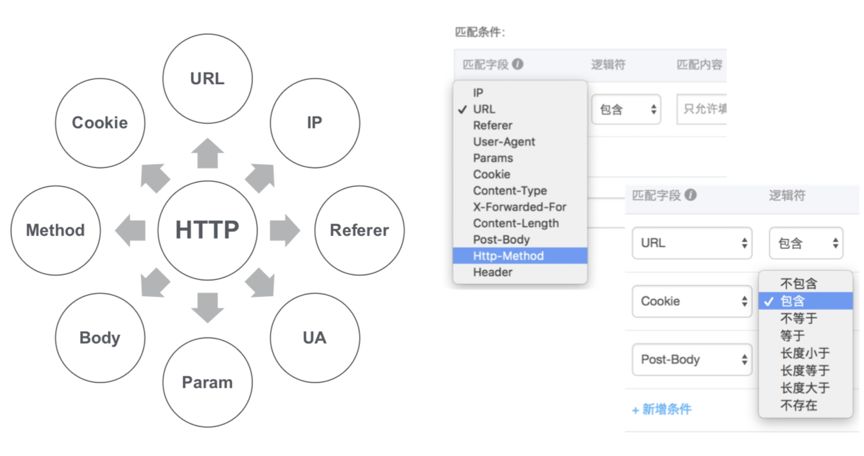 这些明显或不明显的“特征”,都可以作为第一道爬虫检测策略——特征封禁。这里的特征可以是各种HTTP头部、body以及它们的组合条件。阿里云爬虫风险管理产品提供了非常灵活的七层访问控制策略,如同一把应用层的瑞士军刀,是行走江湖的必备佳品: