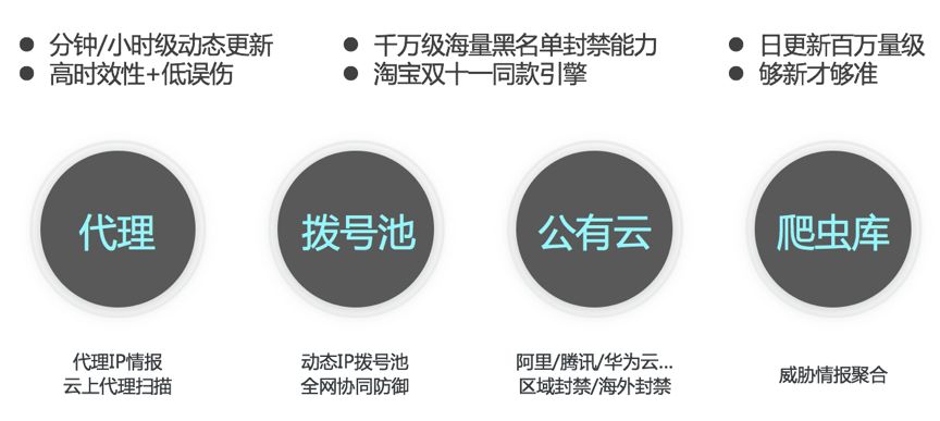 目前阿里云安全团队从云上流量分析出的各种类型的威胁情报库已经具备一定的规模,依据云平台强大的计算能力,可以依据历史一小时/一天/一周(场景不同)的流量情况计算,以应对快速变化的黑灰产资源池,这是我们防爬体系的另一个重要组成部分。