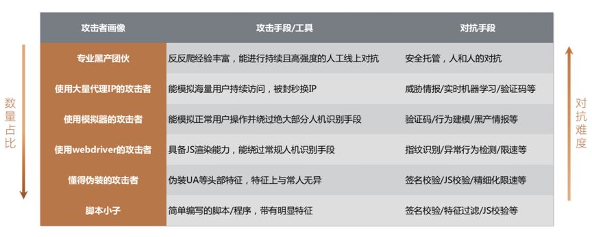 因材施教,对症下药。回到之前对攻击者的分层上来说,我们需要有不同的套路对付不同等级的攻击者。在无数个与线上爬虫对抗的日夜里,我们既见过简单封禁一个IP就搞定的大规模撞库行为,也遇到过具备完善的监控系统和技术人员24小时绕个不停的黑产团伙。从对抗上来说,绝对安全不会被绕过的系统是不存在的,我们能做的就是不断提高攻击者的绕过成本,而这个成本会随着防护层次的丰富指数级上涨。