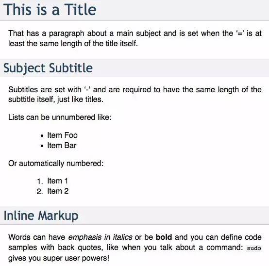 正如您所看到的,纯文本格式的语法非常容易读懂。在创建特定格式(如 HTML)时,标题会成为主要目标,其字体会比副标题大一些(理应如此),并且会对编号列表进行适当的编号。您已经拥有一些非常强大的功能。添加更多的项或更改编号列表中的顺序不会影响到编号,而通过替换使用的下划线可以改变标题的重要性。