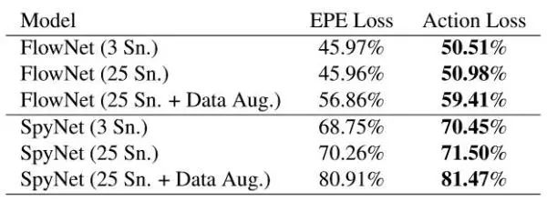 用行为识别分类误差来训练(fine tune)光流比起用EPE误差来能获得更好的行为识别效果。