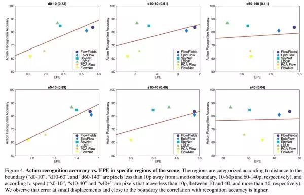 可以看出,两者并没有很强的关联性。并非EPE误差低的光流方法就能获得更好的行为识别精度。进一步,作者探索了光流中的局部区域EPE与动作识别准确率之间的关系,结果如下图所示。