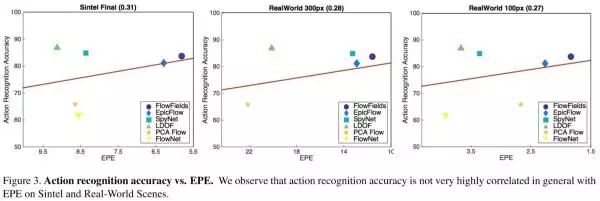 接下来作者讨论了光流的测评指标对于行为识别模型的有效性。目前有大量的光流算法,包括传统的方法以及这几年基于CNN的方法。通常光流使用终点误差(end-point-error, EPE)来衡量准确性。那么此处的问题就是,一个准确性高的光流算法,是否能够带来高的行为识别准确性。实验的结果如下图所示。