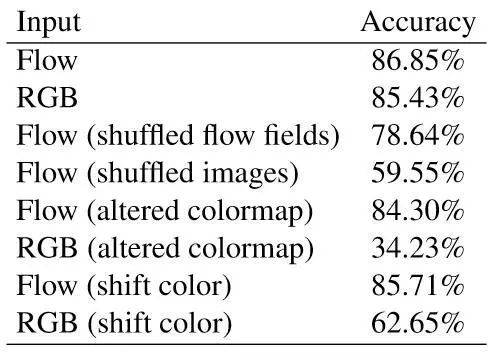 上一步中光流还是逐帧算的,进一步去除时序信息,在计算光流前先打乱图像顺序- Flow (shuffled image),这样得到的光流与物理上的motion已经不符合了,但仍然会包含物体的形状。虽然效果有所下降,但依旧有不错的准确率。这表明motion信息也并非是关键因素。