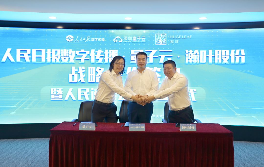 深圳量子云科技有限公司董事长纪卫宁(左一)、人民日报数字传播有限公司董事长兼总经理徐涛、瀚叶股份董事长沈培今(右一)共同签署战略合作协议