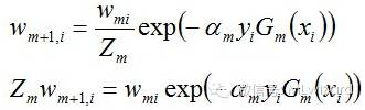 接着更新训练数据的权值分布,用于下一轮迭代: