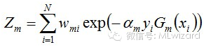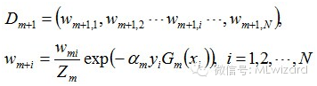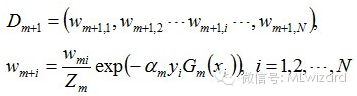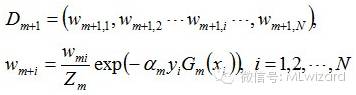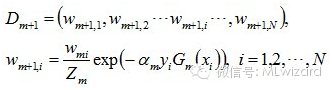 其中,Zm是规范化因子,使得Dm+1成为一个概率分布: