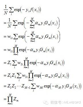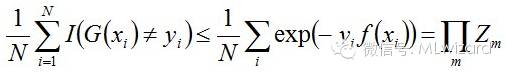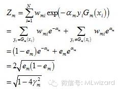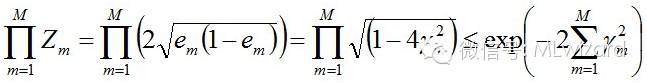 这个结果说明,可以在每一轮选取适当的Gm使得Zm最小,从而使训练误差下降最快。接着,咱们来继续求上述结果的上界。