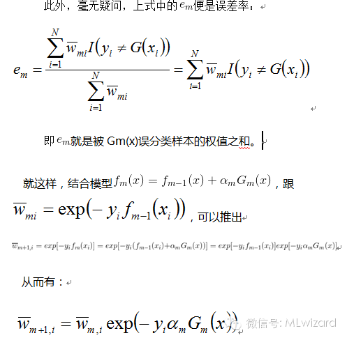 由上述式子可知,Gm(x)在训练数据集上的误差率em就是被Gm(x)误分类样本的权值之和。