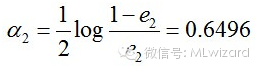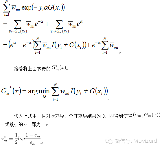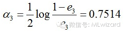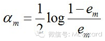 c.计算Gm(x)的系数,am表示Gm(x)在最终分类器中的重要程度(目的:得到基本分类器在最终分类器中所占的权重):