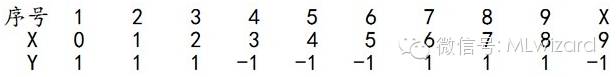 拿到这10个数据的训练样本后,根据 X 和 Y 的对应关系,要把这10个数据分为两类,一类是“1”,一类是“-1”,根据数据的特点发现:“0 1 2”这3个数据对应的类是“1”,“3 4 5”这3个数据对应的类是“-1”,“6 7 8”这3个数据对应的类是“1”,9是比较孤独的,对应类“-1”。抛开孤独的9不讲,“0 1 2”、“3 4 5”、“6 7 8”这是3类不同的数据,分别对应的类是1、-1、1,直观上推测可知,可以找到对应的数据分界点,比如2.5、5.5、8.5 将那几类数据分成两类。当然,这只是主观臆测,下面实际计算下这个具体过程。