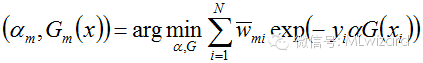 即如果某个样本被分错了,则yi * Gm(xi)为负,负负得正,结果使得整个式子变大(样本权值变大),否则变小。