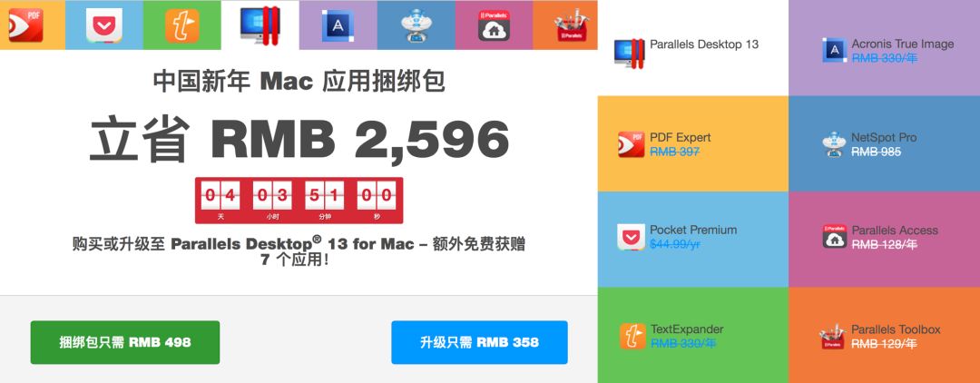 新年刚过,开工不久,著名虚拟机应用开发商 Parallels 就为我们带来一套优惠十足的 Bundle,购买或升级到任意版本的 Parallels Desktop 13,就能一口气将 PDF Expert、TextExpander、Pocket Premium 等 7 款效率工具免费收入囊中,总计节省 2596 元。
