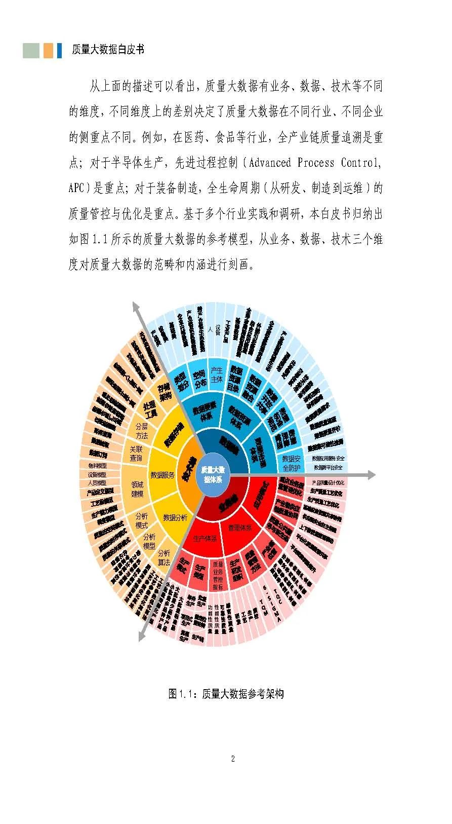 《白皮书》围绕质量大数据的边界内涵、架构体系、资源建设、实施路径、发展趋势和实践案例等方面进行研究。《白皮书》给出质量大数据参考架构统领全文,包括数据视角、技术视角和业务视角三大视角,其中数据资源是价值起点,技术支撑是工具,业务落地是目标,数据、技术、业务三个视角统筹推动质量大数据的建设。