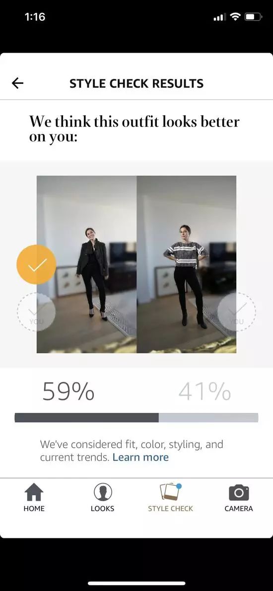 有一天,我想要穿破洞牛仔裤和宽松的系扣领休闲款衬衫。我试着迫使 Echo Look去作出挑选,让它对比这种穿着和某种我觉得我绝不会选择的装扮:我只用高腰裤来搭配的短羊毛衫。
