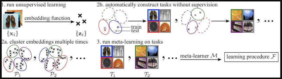 We call our method Clustering to Automatically Construct Tasks for Unsupervised meta-learning (CACTUs). The key insight which CACTUs relies on is that while the embeddings may not be directly suitable for learning downstream tasks, they can still be leveraged to create structured yet diverse training tasks. We assess performance by deploying the meta-learned learning procedure to new human-specified tasks based on unseen images and classes.Code