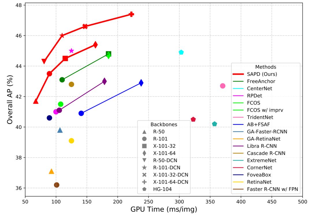 SAPD 可以在 COCO 上实现 47.4% mAP(单模型单尺度)。作者称:SAPD最快的版本可以比其他具有相同的精度的检测器速度快5倍!