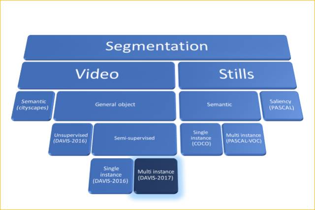 2016 年语义分割领域出现了很成熟的技术,甚至开始接近现有数据集的饱和性能。与此同时,2017 年也是各种视频处理任务爆发性增长的一年:动作分类、动作(时序)分割、语义分割等等。这里我们将着眼于视频目标分割。