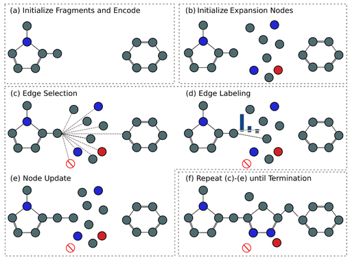 生成过程概览:原始片段(a)通过逐个键的迭代扩展(c-e)来产生分子,包括两个片段(f)原子由图中的节点表示,节点的颜色代表不同的原子类型,而键由边表示,单键、双键和三键的边类型不同