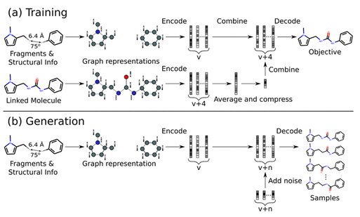 训练和生成过程说明:(a)提供成对的片段和连接的分子作为输入。该模型经过训练,可以从片段和连接分子的编码组合中复制连接分子。(b)在生成时,该模型仅给出未连接的片段和结构信息,并且能够将片段的编码与随机噪声结合来采样生成各种连接的分子。