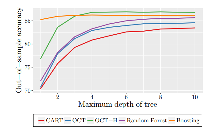 图 4.1:在 60 个真实世界数据集中平均分类方法的性能。OCT 和 OCT-H 分别指的是没有和有超平面分割的最优分类树。