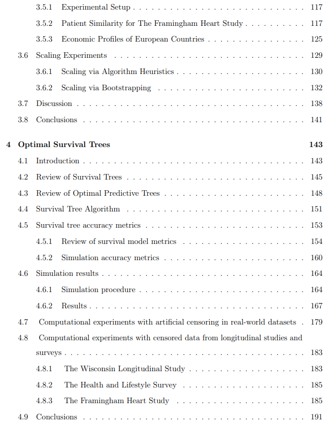 生存分析解决了数据集中出现的挑战,在这些数据集中出现了审查观察结果,其中感兴趣的结果通常是事件发生前的时间,但对于某些人来说,事件的确切时间是未知的。审查结果在医疗保健研究中无处不在,因此,用于生存分析的 ML 方法越来越受欢迎。我们提出了利用 MIO 和局部搜索技术生成全局优化生存树模型的 OST 算法。我们证明 OST 提高了现有生存树方法的准确性,特别是在大型数据集中。本章的主要贡献是: