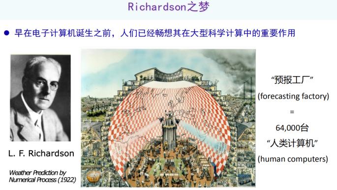 早在电子计算机诞生之前,超级计算的思想萌芽就已产生,其中一个代表性的工作是英国数学家理查德森1922年提出来“预报工厂”的概念,这个概念被称为“理查德森之梦”。